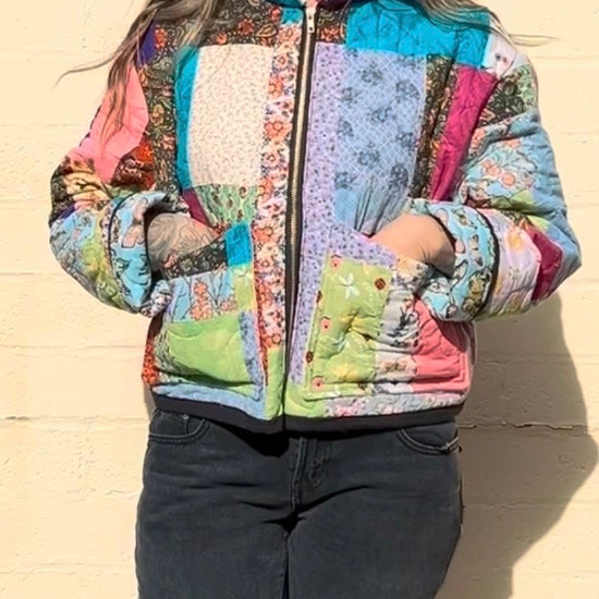 This coat is made from a reclaimed handmade patchwork quilt with bold color, mixed prints, and visible quilting throughout. It’s a statement piece, but still easy to wear.